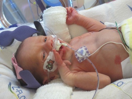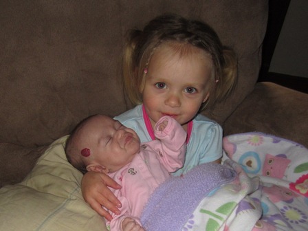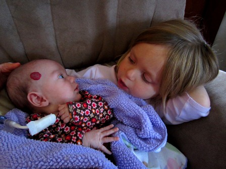 We haven’t mentioned anything about it yet, but I’m sure you’ve already noticed Peanut’s hemangioma. Her hema-what? Peanut’s hemangioma – the large red “birth mark” on her temple. She also has a second on her stomach. (Lulu and I prefer to call them her “strawberries” – much easier to pronounce) Hemangiomas are benign vascular tumors composed of cells that normally line the blood vessels. They are the most common tumor of childhood, occurring in up to 10% of infants. Hemangiomas are more common in Caucasians. They also occur more frequently in girls and low-birth-weight premature infants – I guess Peanut’s 3 for 3.