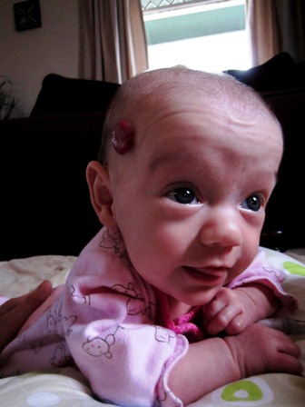 Hemangiomas almost always have a period of growth followed by a period of shrinkage. Peanut’s hemangiomas began their growth phase shortly after birth – which is typical. The one on her stomach first appeared as a small red blotch – much like a common birthmark – about a week after Peanut was born. It slowly grew in size and became raised. The second hemangioma on her temple was just a few days behind.