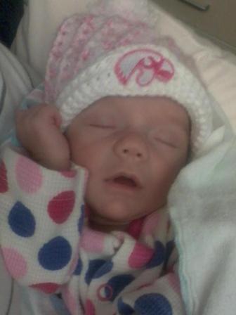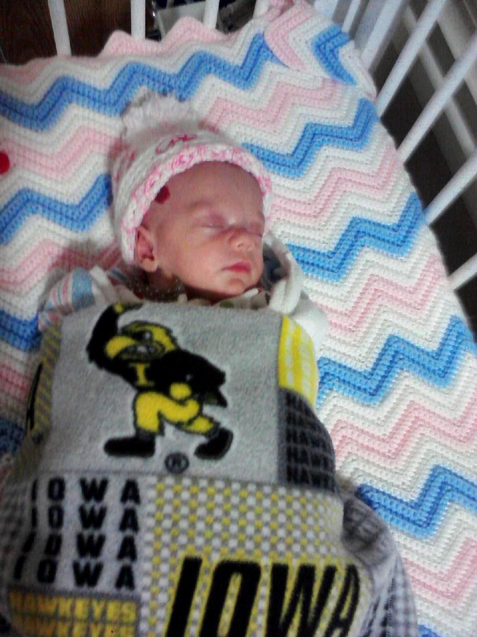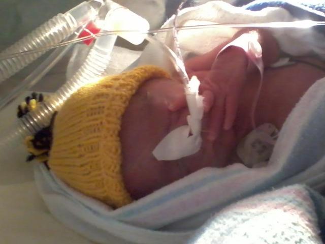 Moments after Peanut was born, the UIHC AirCare helicopter was dispatched to transport her to the the UIHC NICU. (This was because of prematurity – her NEC issue was yet to come.) The transport team brought along a handmade black and gold hat the perfect size for Peanut’s tiny head – Peanut’s first gift. This was the first of many handmade items we would receive from the Preemie Project during her extended stay at the UIHC.